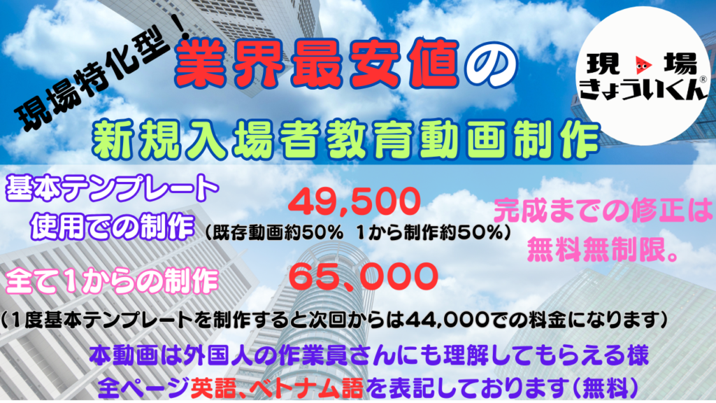 現場特化型新規入場者教育動画ですが、基本どんな制作依頼でも受け付けております。現場に入場される全ての作業員さん、年配の方や外国人の方にもわかりやすく、試聴していて疲れにくい(堅苦しい文字ばかりではなく少しポップに)動画を意識して制作しております。詳しい料金は料金表をご確認ください。