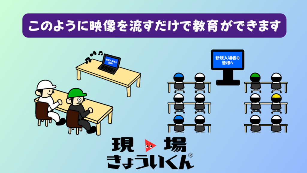 新規入場者教育の動画を作成し、現場事務所にテレビやモニター(タブレットやパソコンでも可能)を設置し動画を流す事で、毎日同じ品質の教育ができ、さらに監督さんの手間が省け朝の忙しい時間を楽に、有効に使えます!
